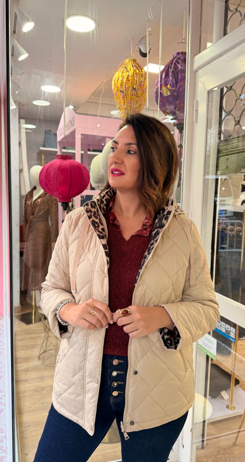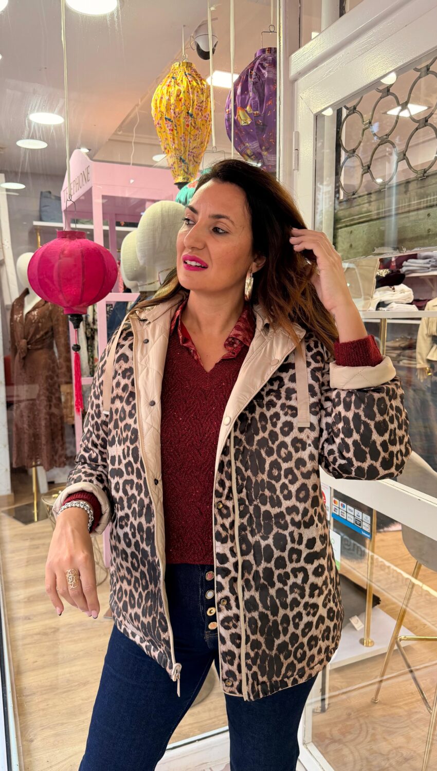 Chaqueta reversible acolchada, con un lado en color beige liso y el otro estampado animal print. Ligera, cómoda y muy versátil.