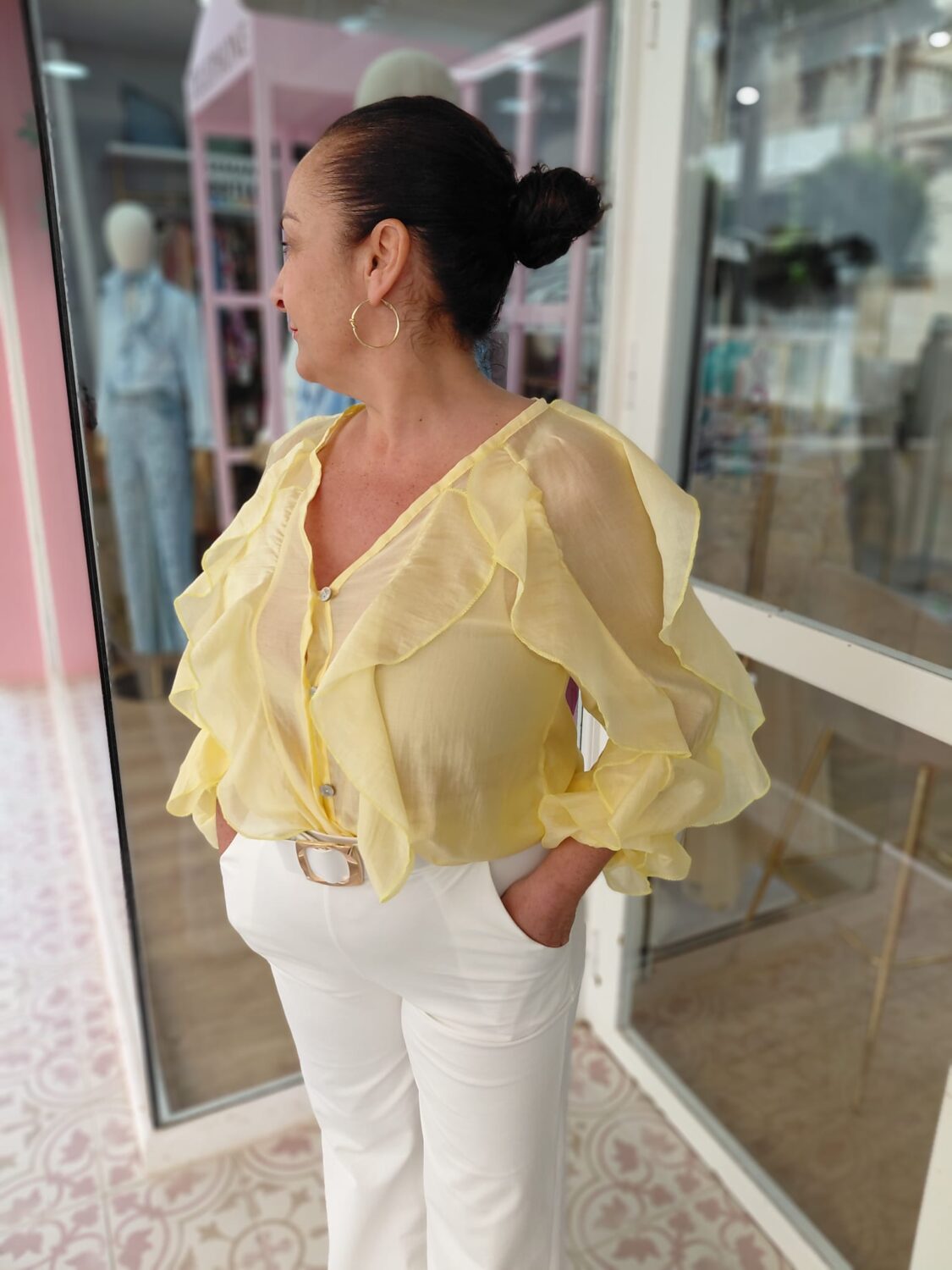 Color y Material: Está confeccionada en una tela amarillo pastel con un acabado semitransparente y un ligero brillo satinado, lo que le aporta mucha luminosidad.