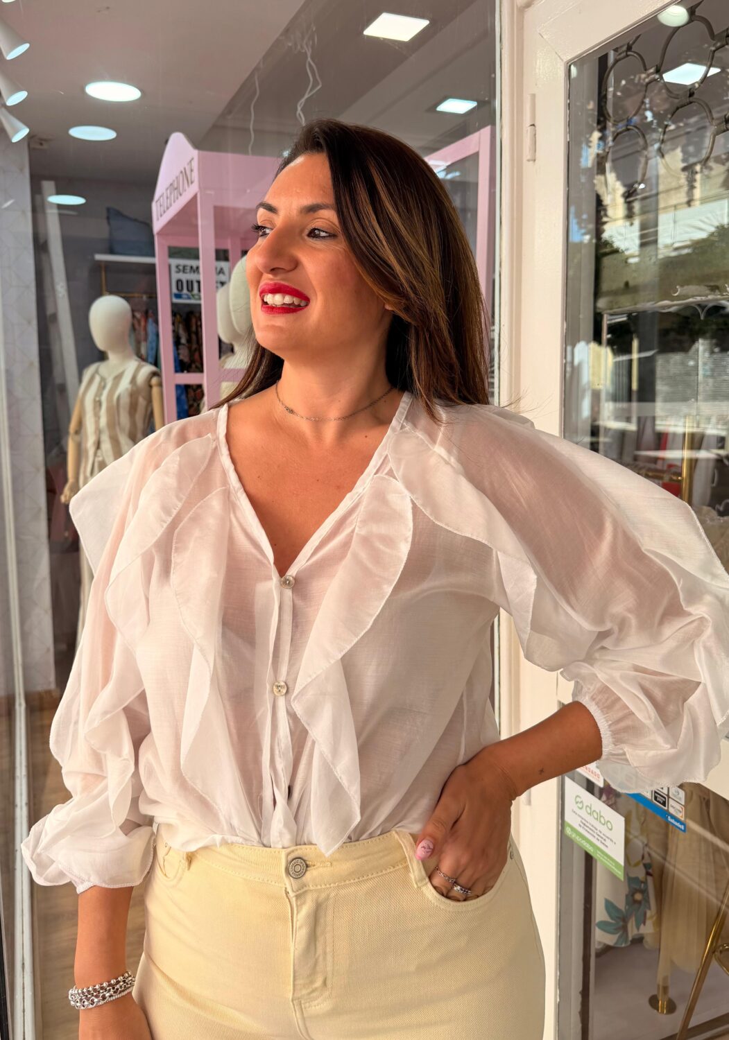 Color y Material: Está confeccionada en un tejido fluido de color blanca con un acabado ligeramente satinado y traslúcido.