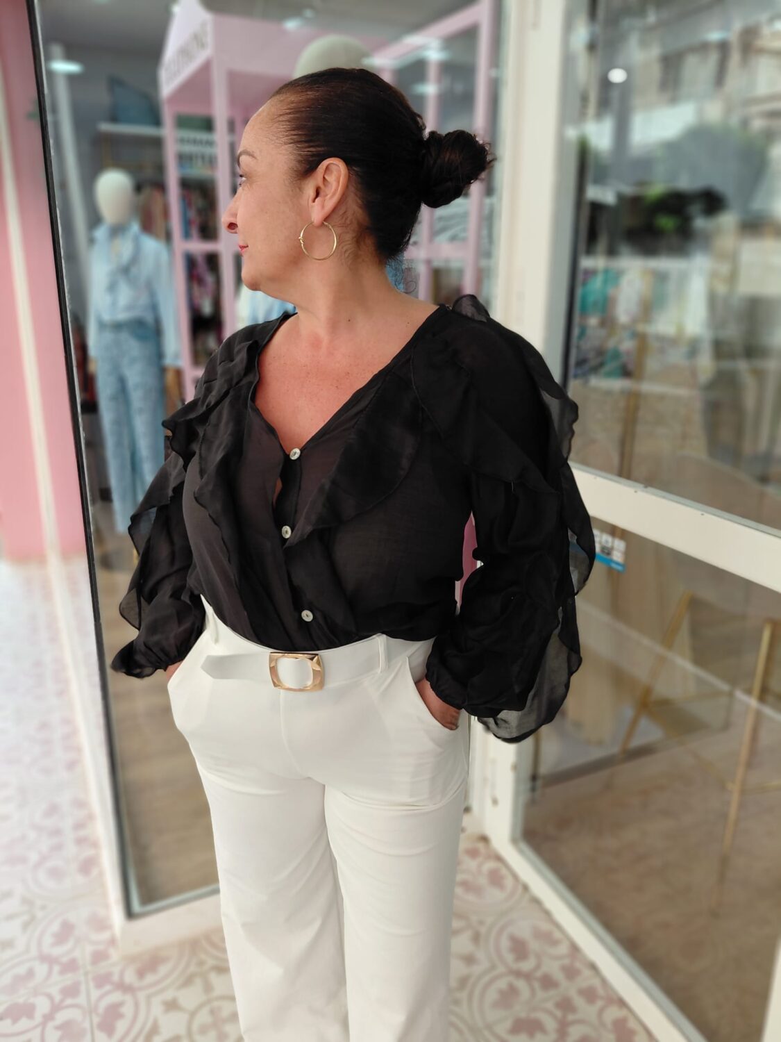 Color: Negro sólido, un clásico versátil que combina perfectamente con prendas claras (como los pantalones blancos de la imagen) para crear contraste.