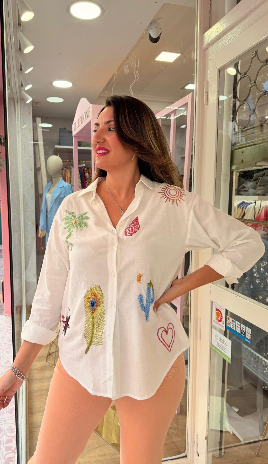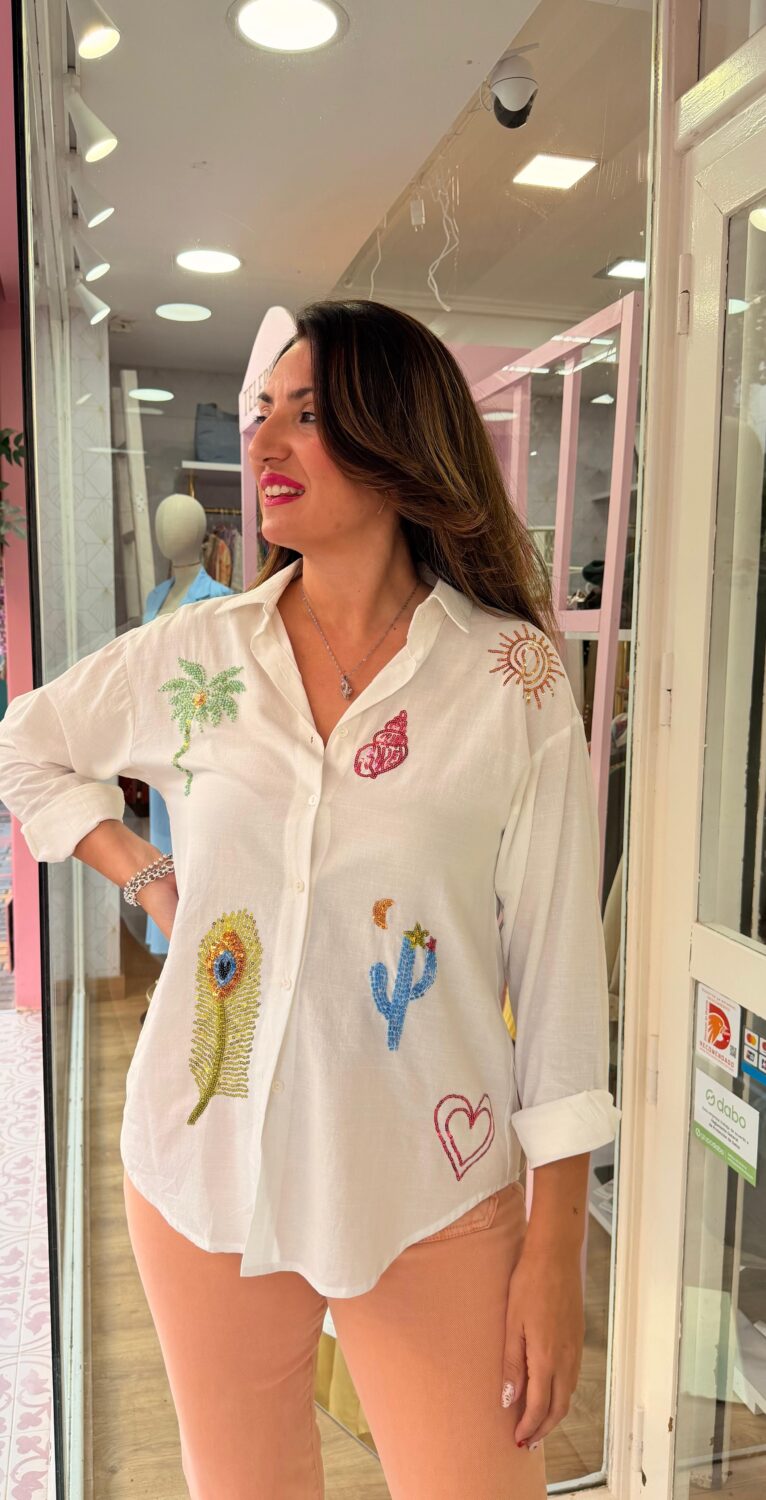 Prepárate para atraer todas las miradas con esta blusa de estilo camisero en color blanco puro que destaca por su original despliegue de parches joya inspirados en un oasis de fantasía. Cada detalle está cuidadosamente diseñado con cuentas y lentejuelas brillantes incluyendo desde una palmera exótica y un cactus azulado hasta plumas de pavo real y soles radiantes que aportan una textura rica y lujosa a la prenda. El tejido ligero y transpirable con acabado natural la convierte en la opción perfecta para los días de sol mientras que su diseño artístico permite llevarla cerrada para un estilo más estructurado o abierta sobre un top básico para un aire más bohemio y relajado. Es sin duda una pieza de diseño que combina la frescura de una camisa clásica con la diversión de los apliques multicolores convirtiéndola en la protagonista indiscutible de cualquier outfit veraniego.