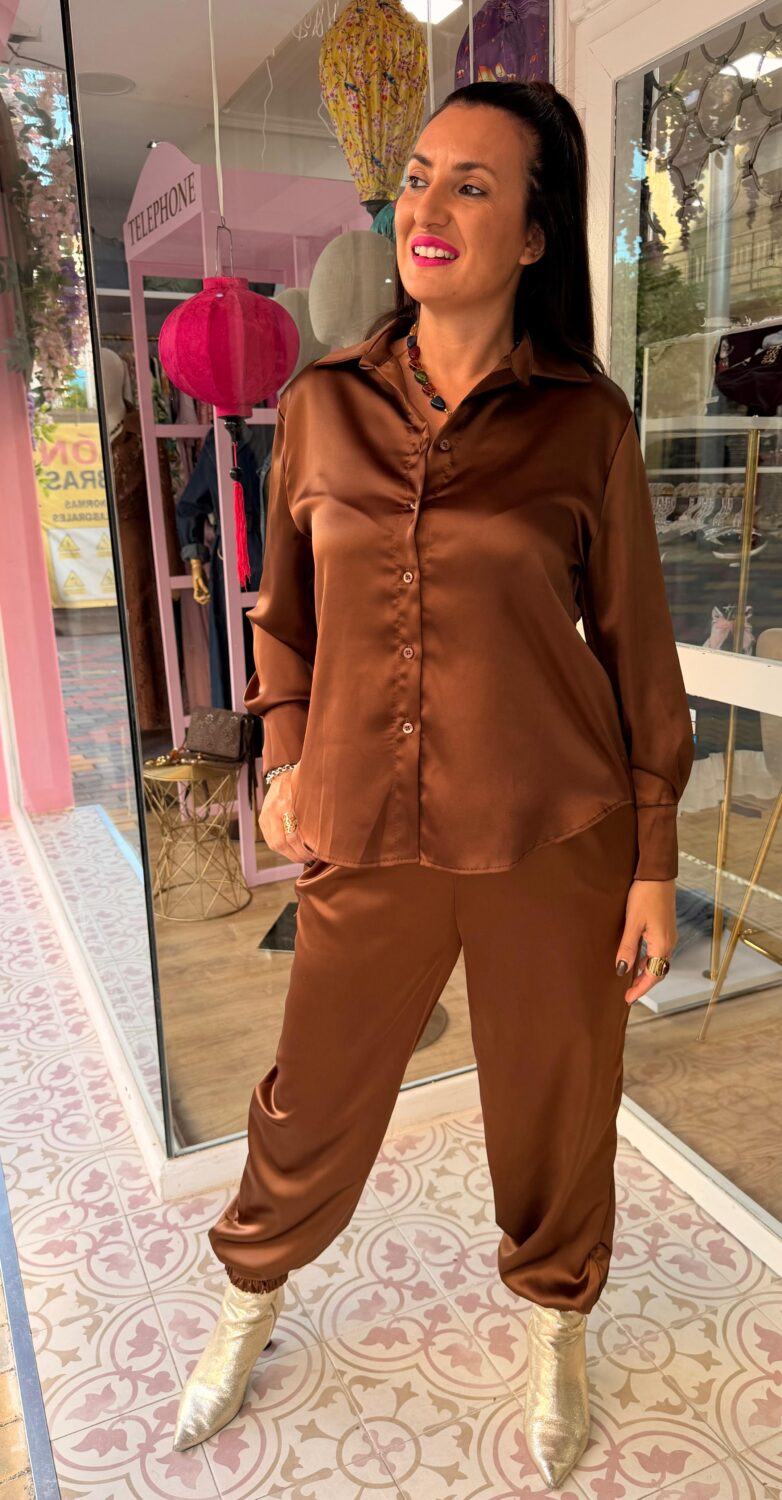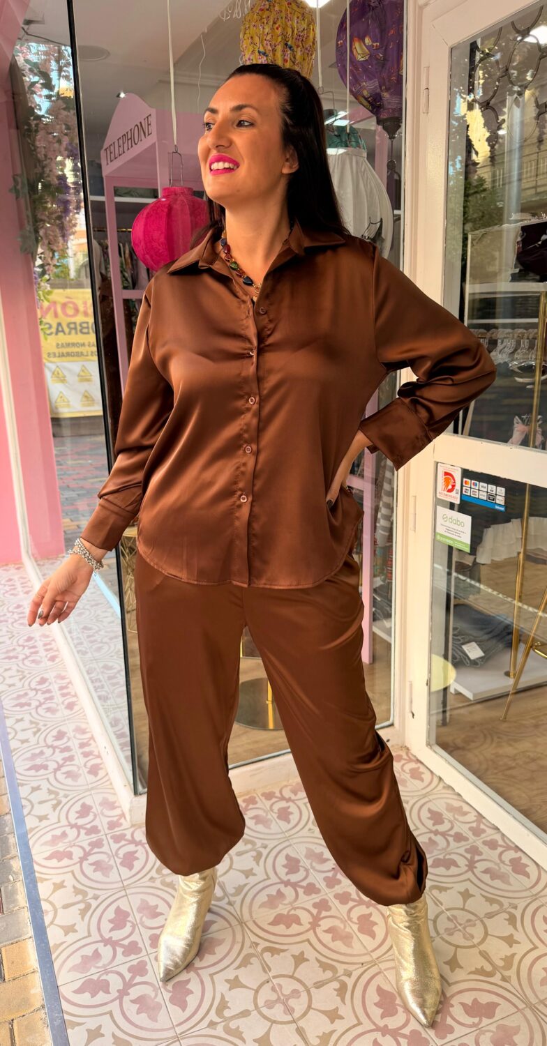 Blusa de satén con brillo sueve, manga larga y cierre de botones, ideal para looks elegantes o casual chic.