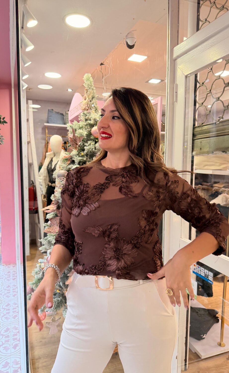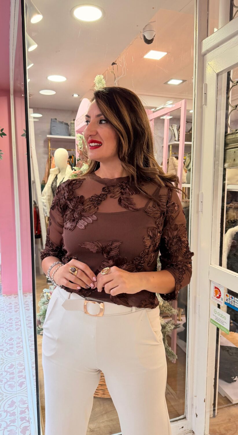 Confeccionada en una malla o tul semitransparente en un rico tono marrón chocolate o cacao, la blusa destaca por sus hermosas aplicaciones florales tridimensionales que le otorgan cuerpo y un efecto visual espectacular. El escote es redondo y alto, con un ligero efecto de transparencia en la parte superior que le da un aire sensual y delicado.