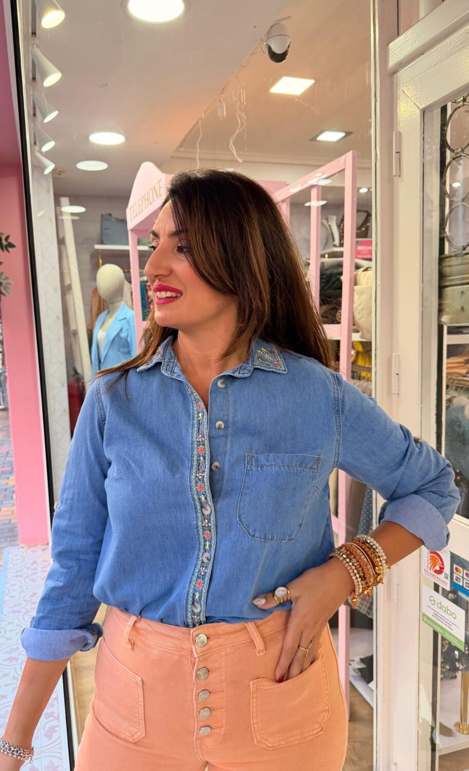 Esta blusa de tejido denim en un tono azul medio combina la resistencia del vaquero con detalles artesanales que la hacen única. Lo más destacado es el ribete bordado con motivos étnicos que recorre verticalmente la zona de los botones y decora las puntas del cuello, aportando pequeñas pinceladas de color en tonos naranja y turquesa. La prenda incluye un práctico bolsillo frontal y mangas que permiten llevarse remangadas para un estilo más informal, funcionando perfectamente con pantalones de colores cálidos, como el salmón, para un look bohemio y relajado.
