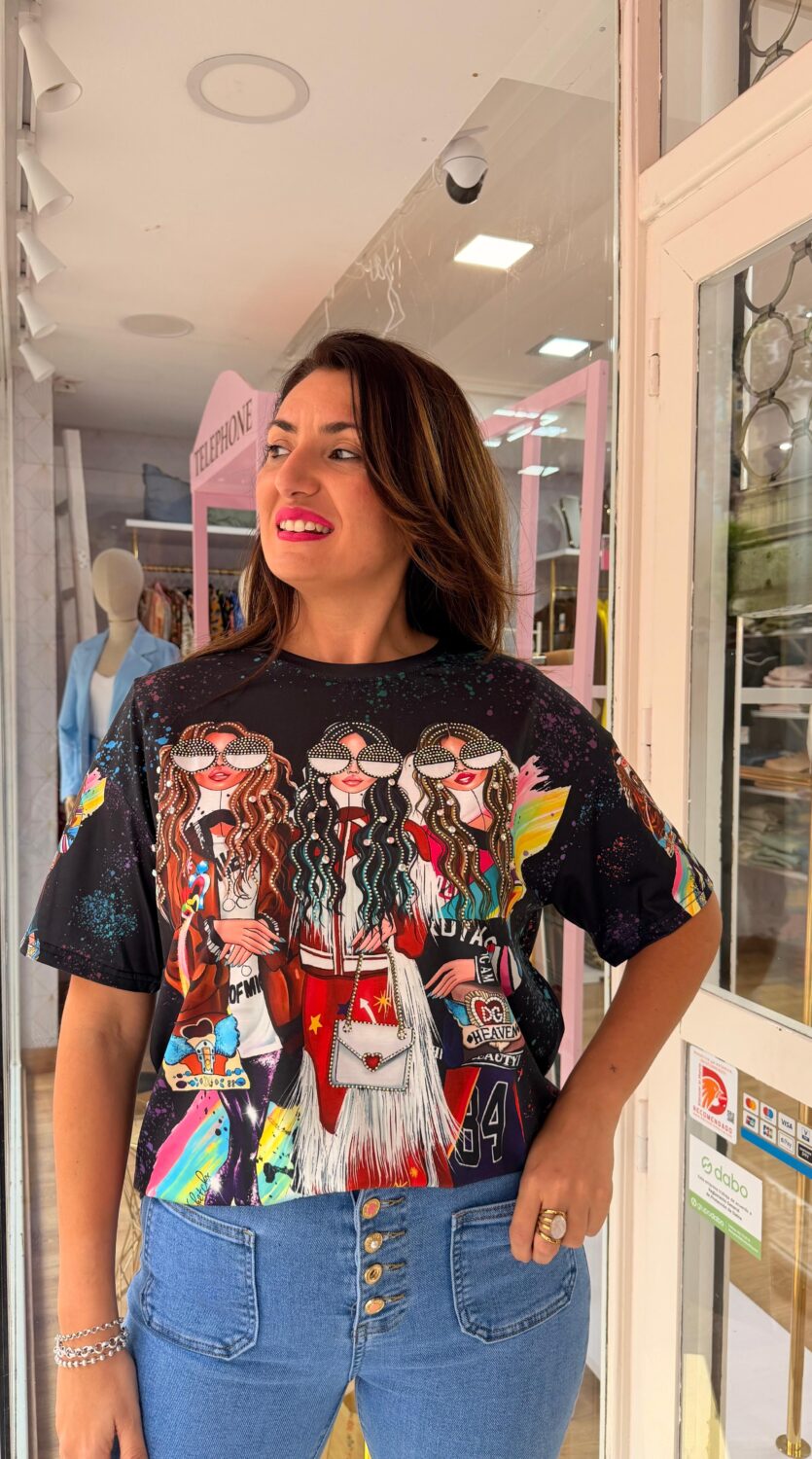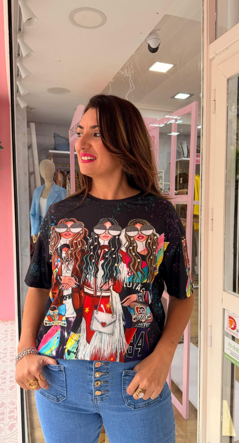 Esta camiseta redefine el concepto de básico gracias a su potente diseño visual y su estética contemporánea. La prenda presenta una ilustración frontal vibrante de tres figuras femeninas con un estilo “fashionista” impecable, resaltado por detalles de pedrería brillante en las gafas de sol que aportan relieve y un destello de luz único. El fondo negro de la camiseta sirve como lienzo para salpicaduras de pintura multicolor tipo grafiti en tonos neón y destellos de purpurina, creando un contraste dinámico y lleno de energía.