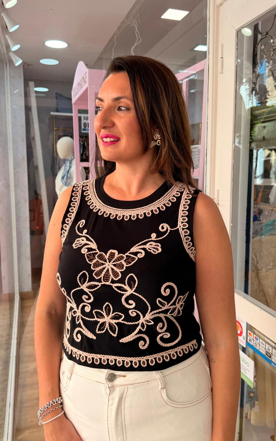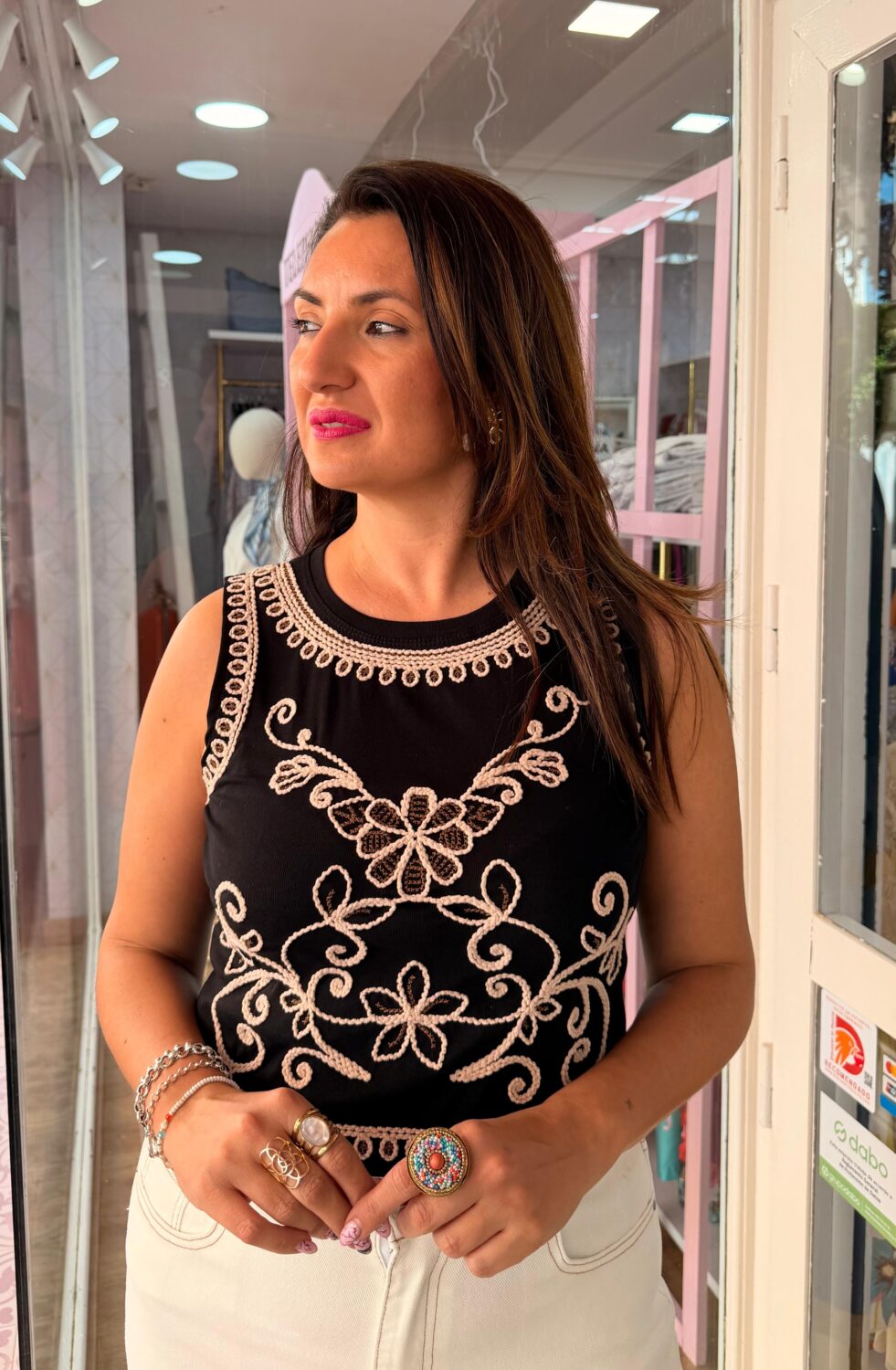 Esta camiseta sin mangas color negro destaca por su exquisito y detallado bordado. El diseño presenta intrincados patrones florales y de espirales, que contrastan delicadamente con la base neutra. Estos bordados no solo adornan la parte frontal, sino que también bordean los orificios de los brazos y el cuello redondo, añadiendo un toque de elegancia y textura única.