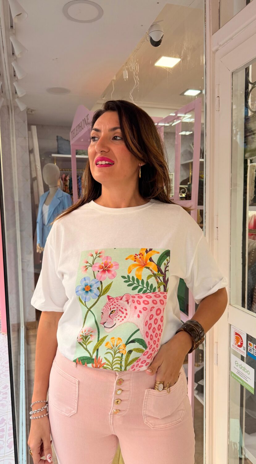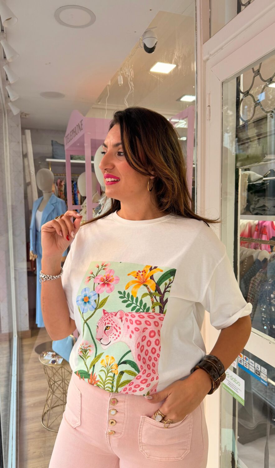 Esta camiseta de manga corta se convierte en la protagonista indiscutible de cualquier conjunto gracias a su vibrante y detallado diseño central. Sobre un fondo blanco puro, destaca una ilustración artística que combina la fuerza de una pantera en tonos rosas moteados con la delicadeza de una composición floral exuberante. Los matices verdes, naranjas y azules del estampado crean un contraste visual refrescante, aportando una estética tropical y moderna a una prenda básica.
