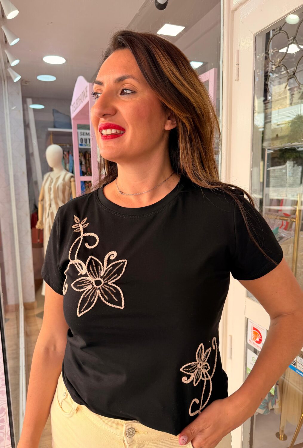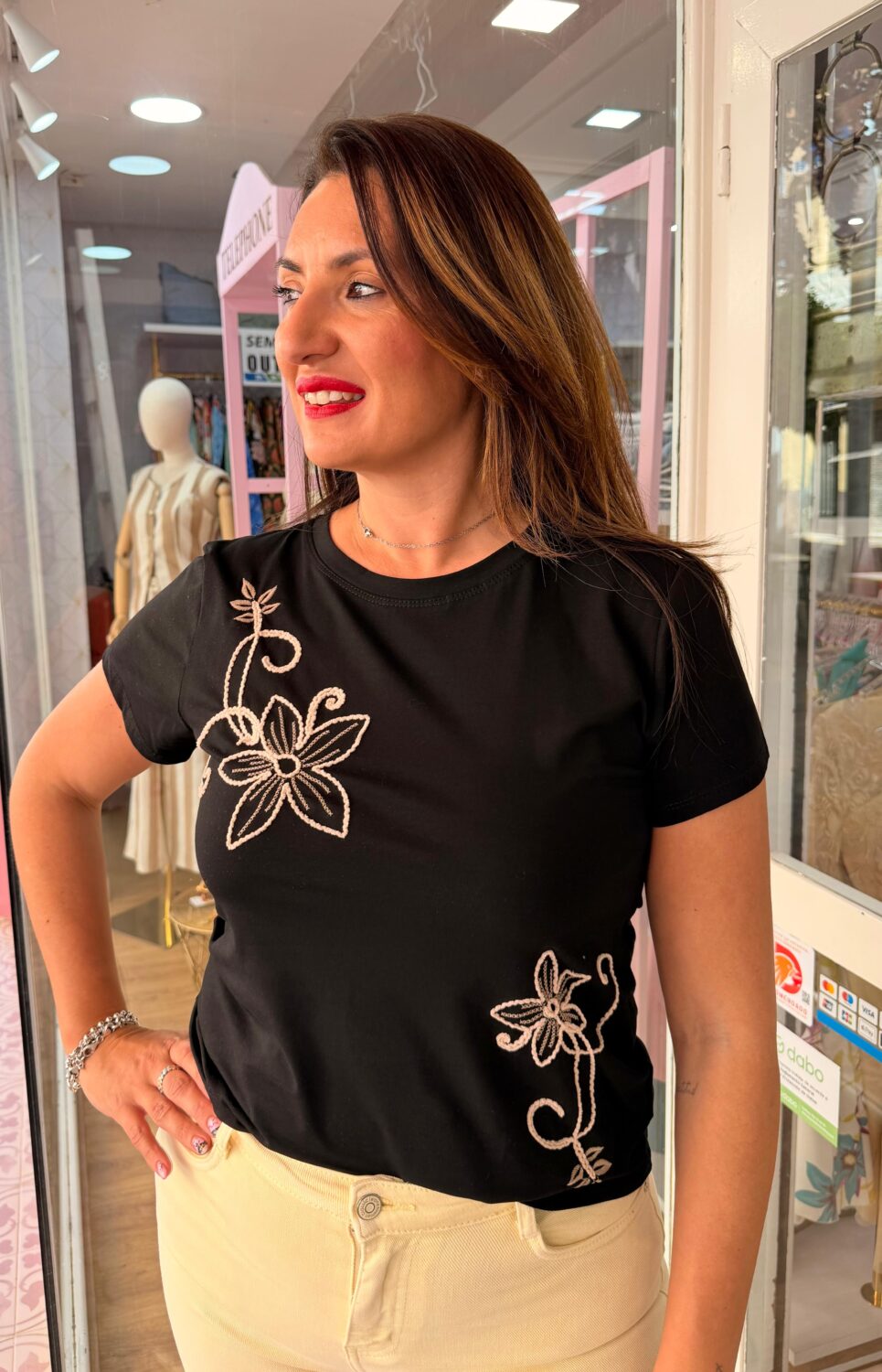 Esta camiseta de color negro con cuello redondo y manga corta está decorada con dos bordados florales de color beige, uno grande en el hombro izquierdo y otro más pequeño en la parte inferior derecha. Esta camiseta es ideal para llevar con vaqueros o faldas y perfecta para los días de verano. Además, tiene un diseño sencillo y elegante que te permitirá combinarla con cualquier otra prenda de tu armario.