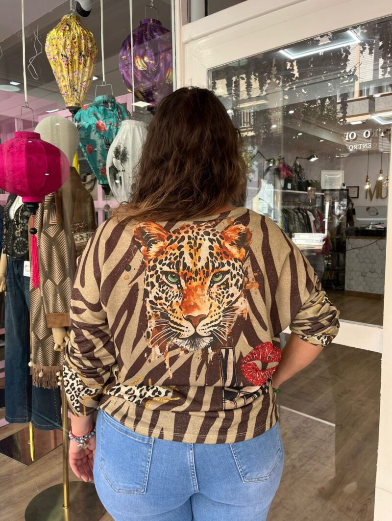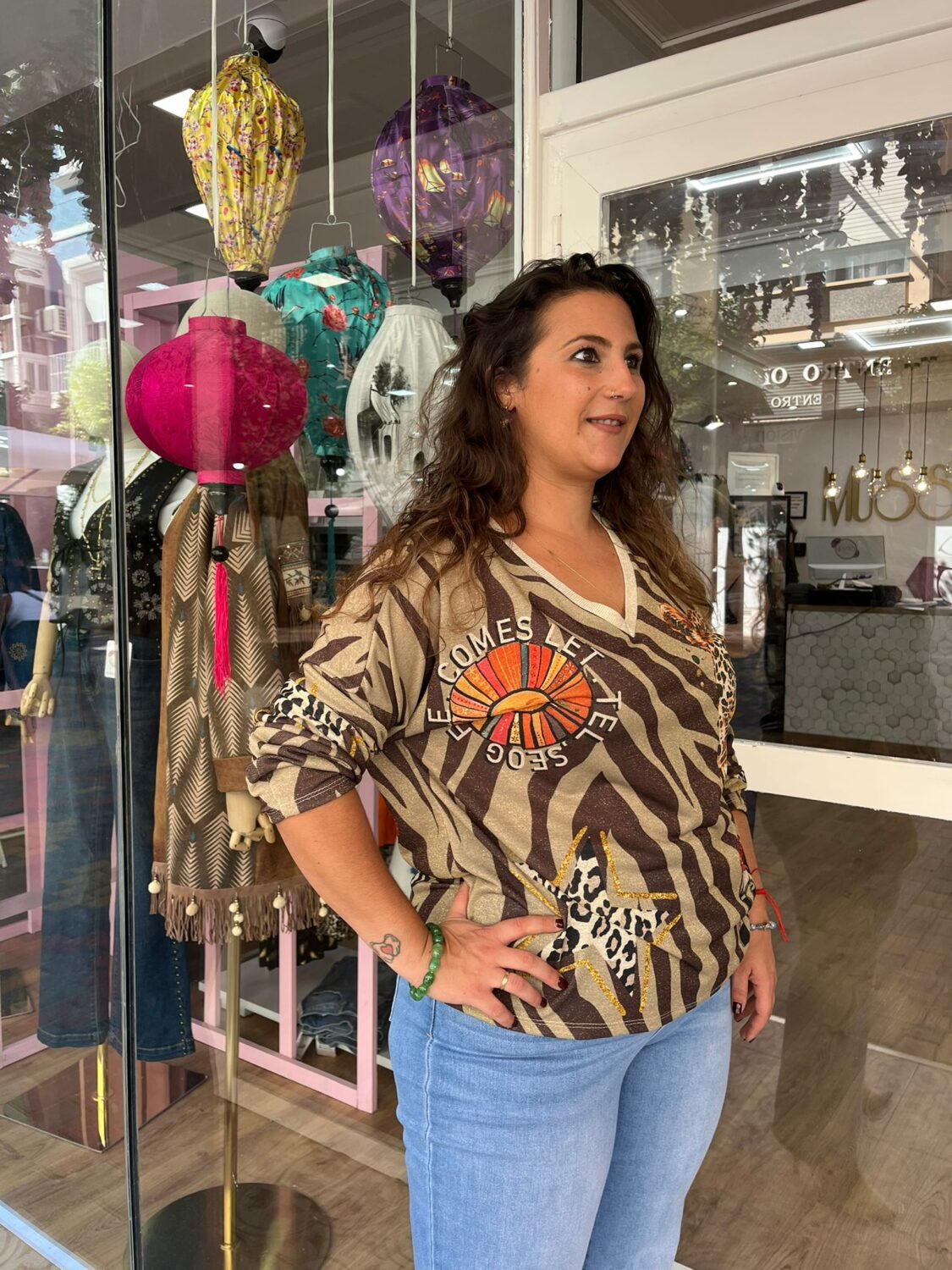 Camiseta estampada con un poco de brillo. Talla única tiene 62cm de sisa a sisa.