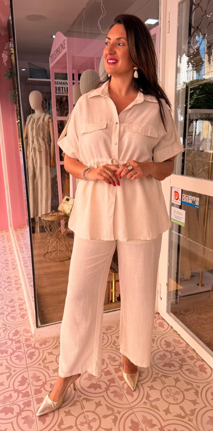Este sofisticado conjunto de dos piezas en color beige es la elección perfecta para quienes buscan un equilibrio entre un estilo utilitario y la elegancia relajada. La parte superior está diseñada con un cuello camisero clásico y una botonadura frontal que aporta estructura, mientras que el cordón ajustable en la cintura permite entallar la silueta de forma personalizada, creando un efecto visual muy favorecedor. Sus mangas cortas con detalle de vuelta y los bolsillos de solapa en el pecho le confieren un aire moderno y funcional que se adapta a cualquier ritmo de vida.