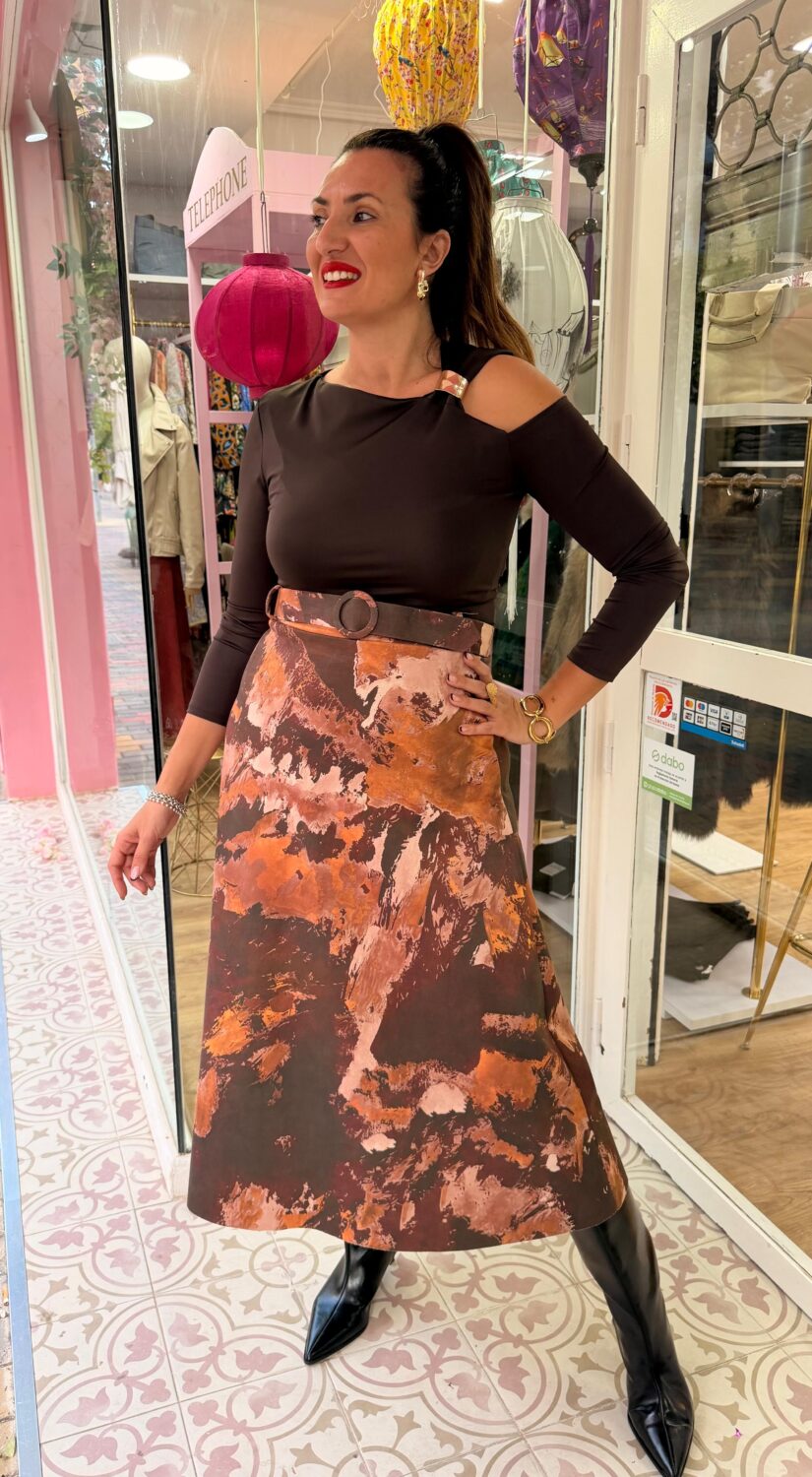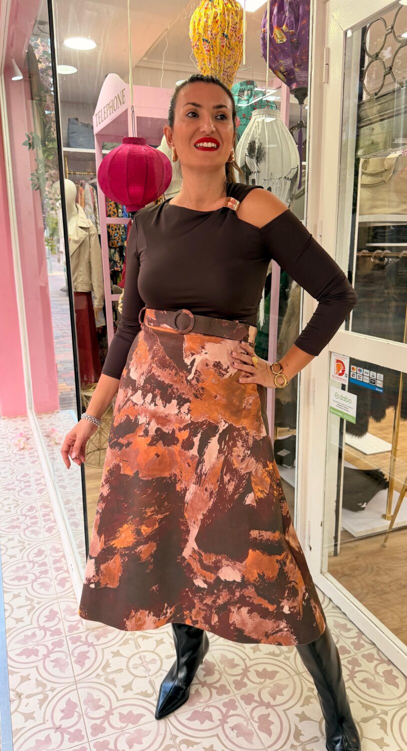 Falda midi y de corte recto con ligero vuelo, confeccionada en un tejido con estampado artístico abstracto. Tiene una cintura alta con cinturón del mismo tejido y hebilla redonda. Para un look original y elegante.