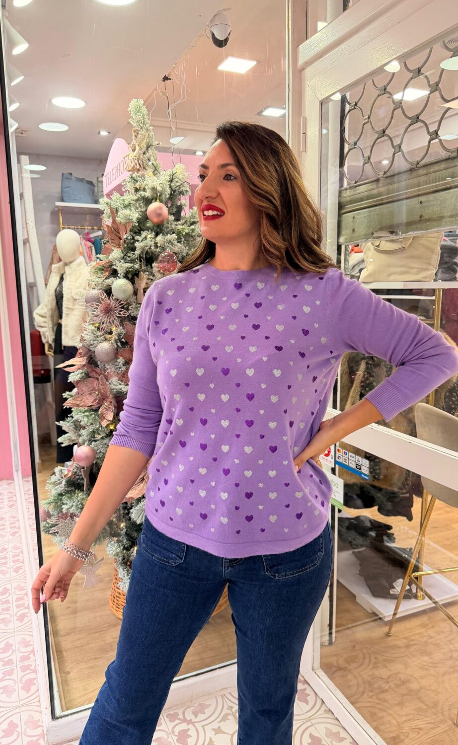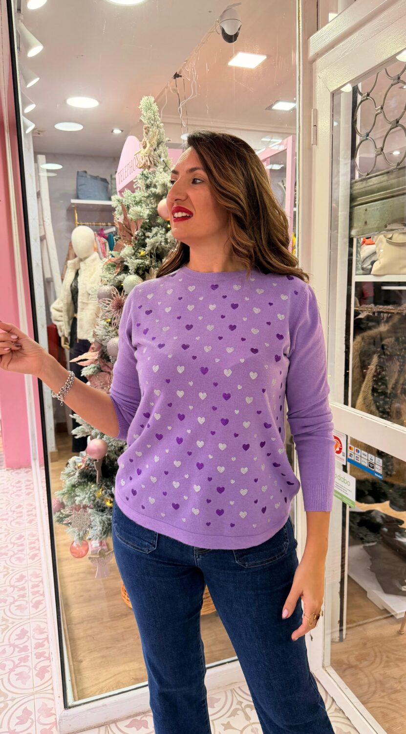 Este jersey destaca por su encantador estampado de corazones pequeños distribuidos por toda la prenda. La magia está en el detalle: una mezcla de corazones en plata y oro metalizado que brillan sutilmente con cada movimiento, añadiendo un aire festivo y muy coqueto.