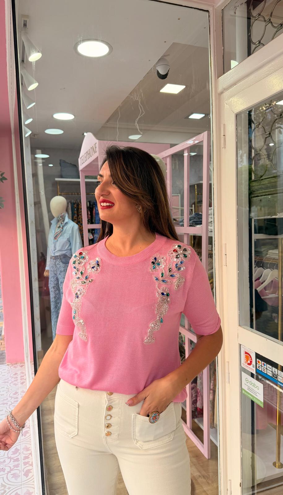 Deslumbra con este jersey de punto fino en color rosa, una prenda que combina la sencillez de un básico con el lujo de sus aplicaciones artesanales. Destaca por su exquisito bordado de pedrería multicolor en el escote y los hombros, aportando una luz increíble al rostro sin necesidad de complementos. Su diseño de cuello redondo y manga media al codo lo convierte en la elección ideal para un look sofisticado y cómodo, perfecto tanto para combinar con pantalones de vestir en tonos pastel como con tus jeans favoritos.