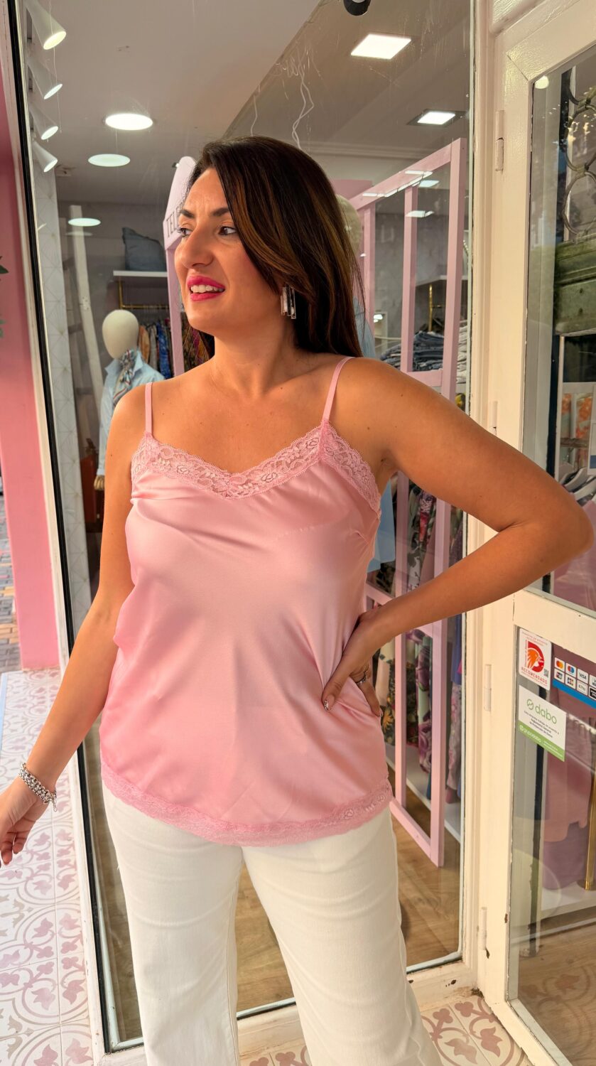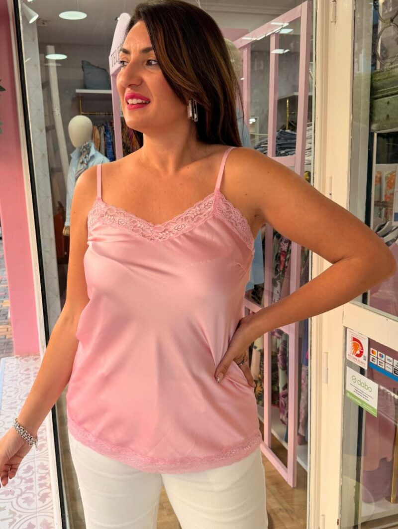 Elegante top de estilo lencero en un profundo y sofisticado color rosa confeccionado en un tejido satinado de brillo sutil que aporta un aire de lujo y distinción a cualquier conjunto femenino