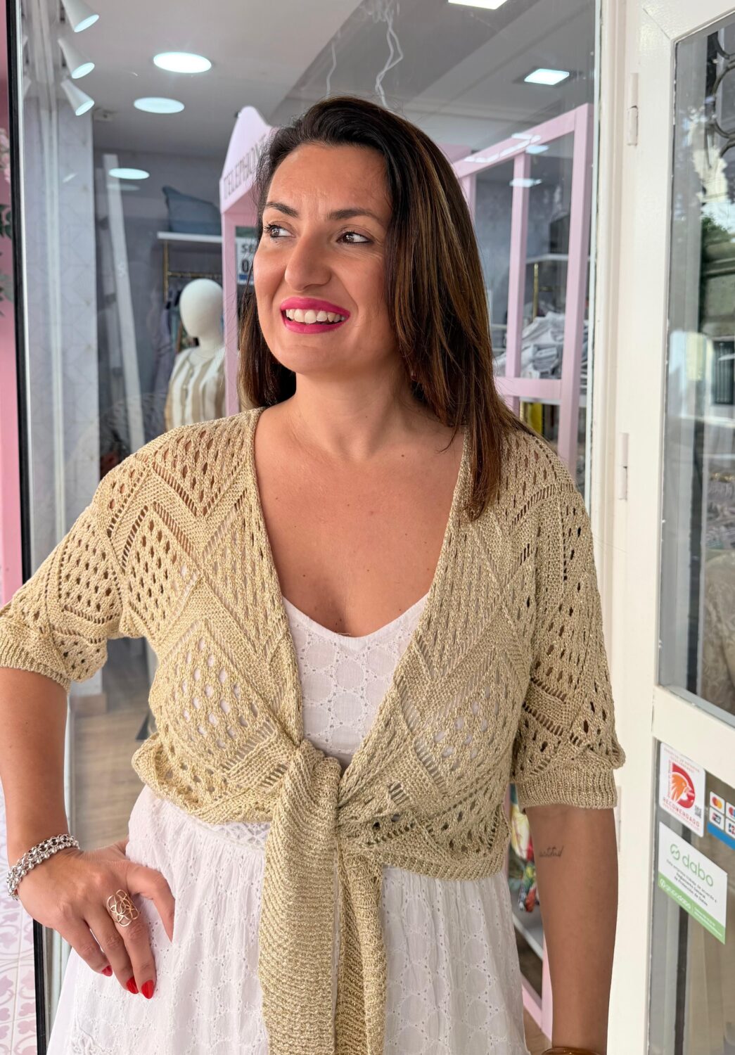La prenda destaca por su exquisito tejido de punto en hilo metalizado color oro, que presenta un delicado patrón geométrico de calados que juegan con las transparencias. Su diseño de manga francesa y corte tipo bolero se completa con un cierre frontal mediante lazada, lo que permite ajustarla a la cintura para definir la silueta o llevarla más abierta según el estilo que busques. El brillo sutil del hilo dorado capta la luz de manera elegante, asegurando que seas el centro de todas las miradas.