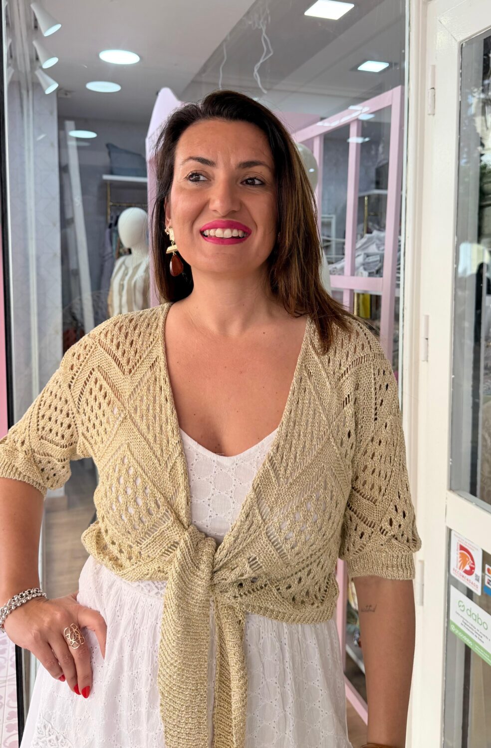 Eleva cualquier conjunto con nuestra Rebeca Golden Glow, una pieza de punto calado diseñada para aportar un toque de luz y distinción a tus estilismos. Esta rebeca es el accesorio ideal para las noches frescas de verano o para transformar un vestido básico en un look de invitada espectacular.
