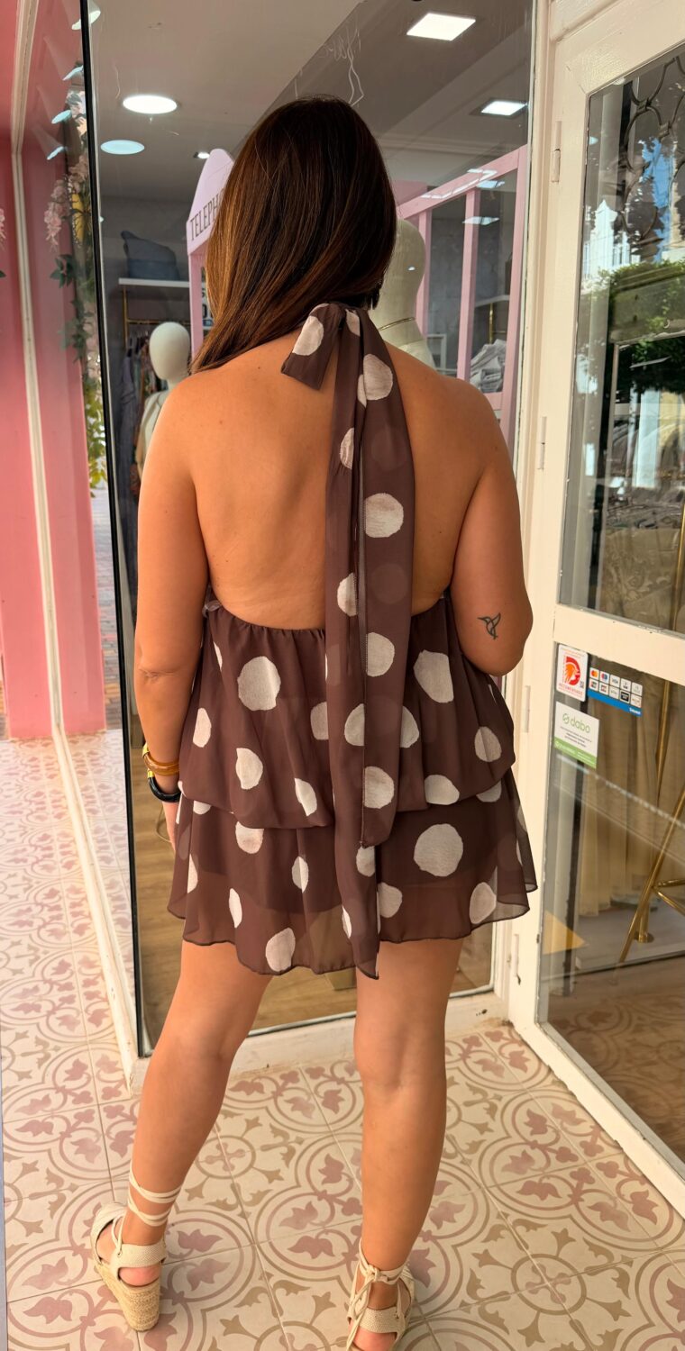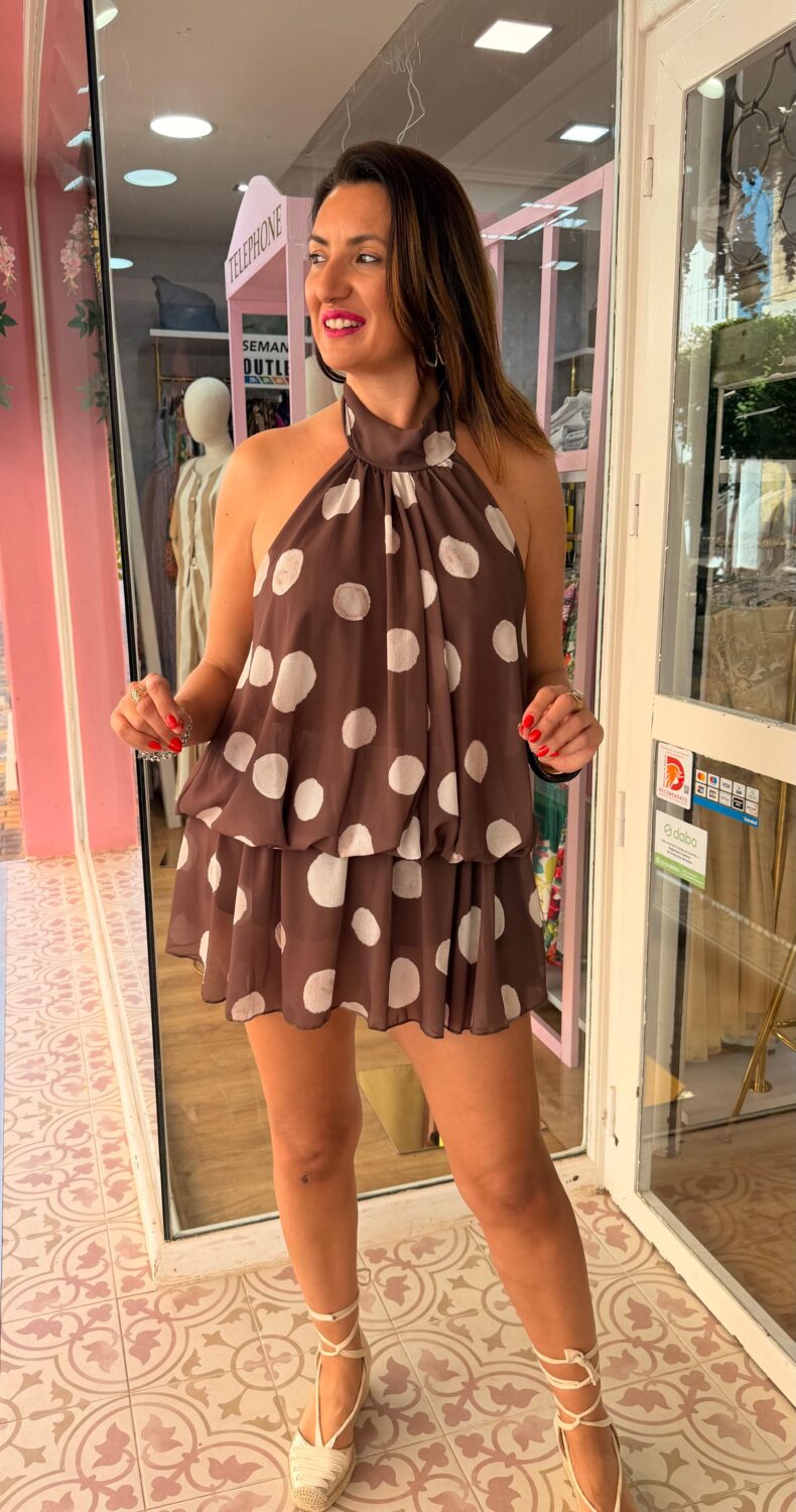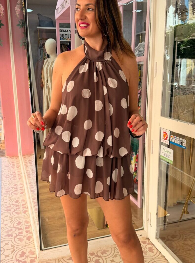 El vestido presenta un favorecedor escote tipo halter que realza los hombros y estiliza el cuello, dando paso a una silueta de doble volante que aporta un volumen romántico y divertido. Su tejido ligero en color chocolate está decorado con grandes lunares en blanco roto que le confieren ese carácter atemporal y femenino tan buscado cada temporada. La caída fluida de la prenda asegura una comodidad total mientras bailas o caminas, adaptándose con suavidad a tus movimientos.