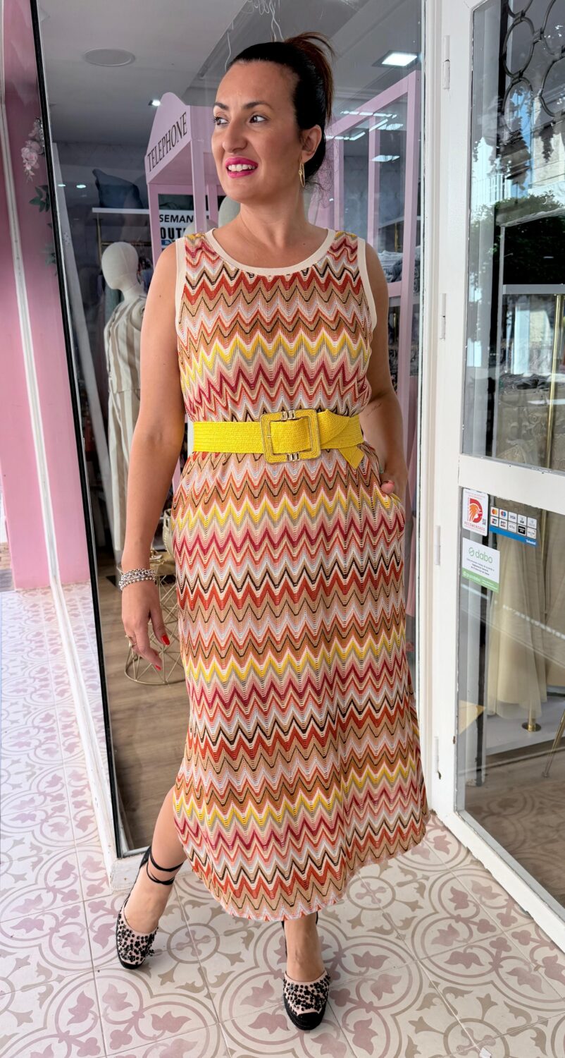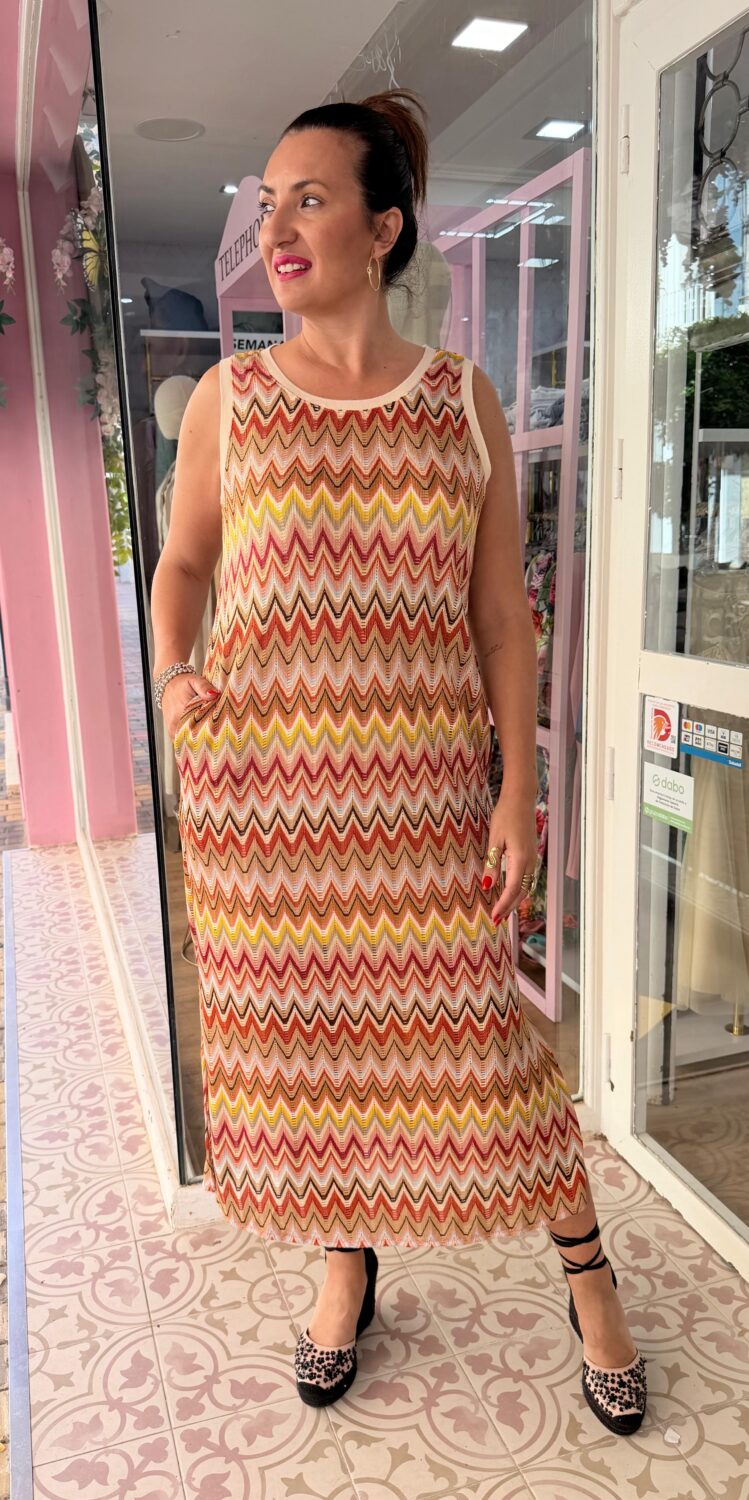 Añade un toque vibrante a tu colección con nuestro vestido midi “Caribe”. Destaca por su tejido de punto calado con patrón de zig-zag, una técnica que crea una textura rica y un juego visual dinámico. Su paleta de colores en tonos cálidos (amarillo, naranja, terracota y blanco) evoca la luz de un atardecer veraniego, convirtiéndolo en una pieza alegre y sofisticada a la vez.