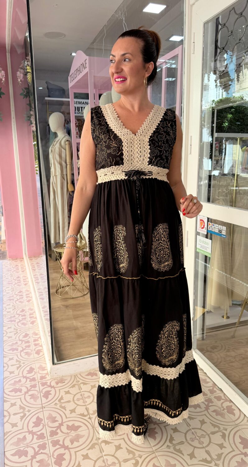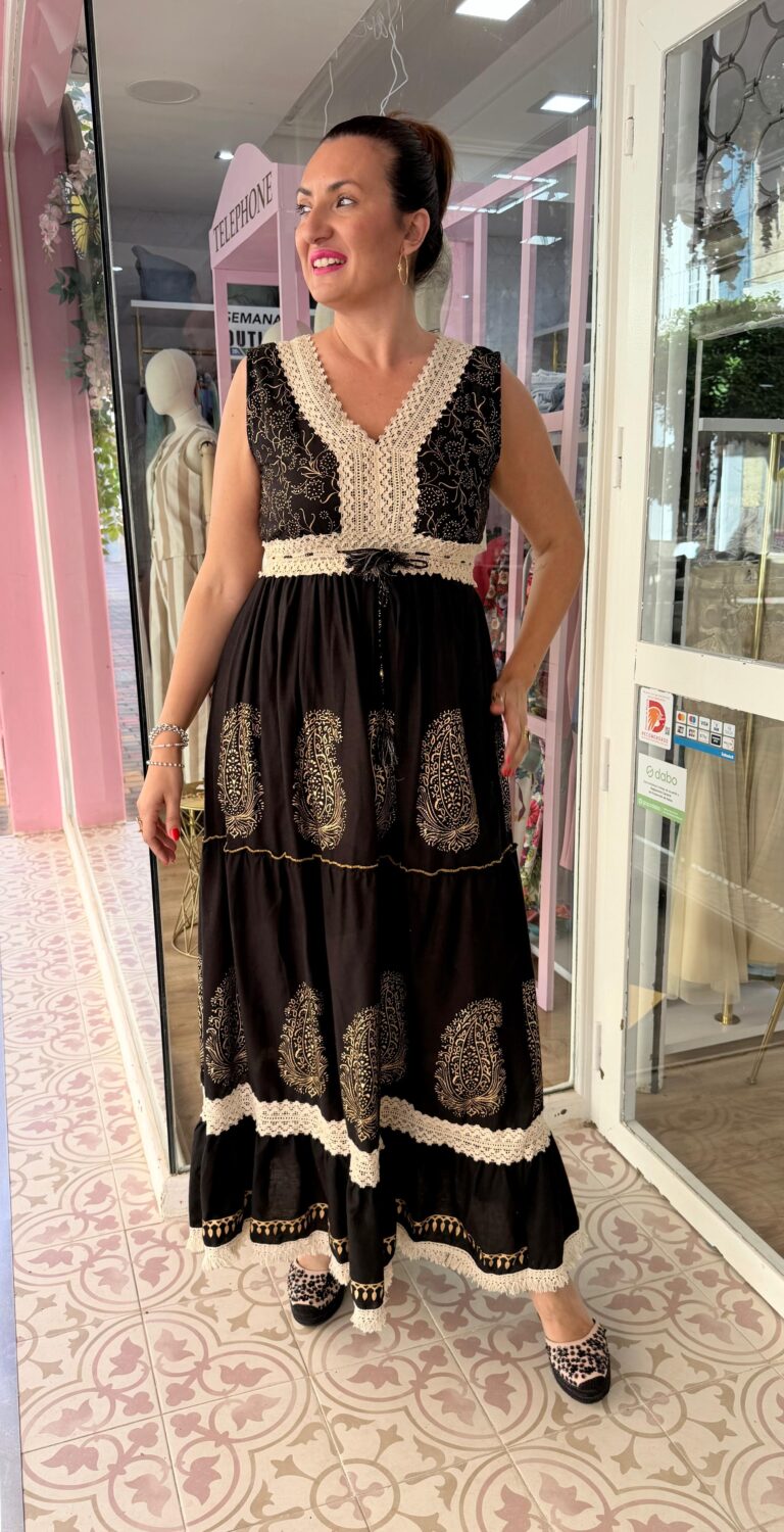 Viaja sin moverte de lugar con este impresionante vestido maxi de inspiración étnica. Confeccionado en un tejido negro de tacto agradable, esta pieza se distingue por sus exquisitos estampados paisley en dorado, que evocan la magia de los zocos y los atardeceres exóticos.