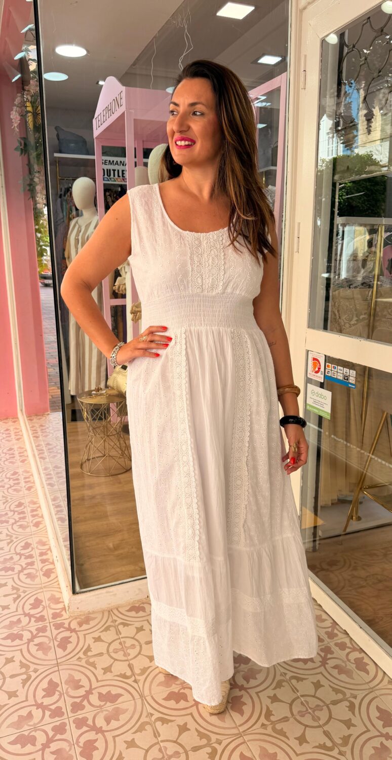 Este vestido largo destaca por su delicado trabajo de bordado suizo y calados repartidos por toda la prenda, aportando una textura exquisita y una feminidad clásica. Cuenta con un cuerpo entallado mediante un nido de abeja en la cintura que realza la silueta de forma cómoda y elástica, dando paso a una falda larga con paneles que generan un vuelo espectacular al caminar. El escote redondo y los tirantes anchos proporcionan una sujeción perfecta y un aire juvenil y fresco.