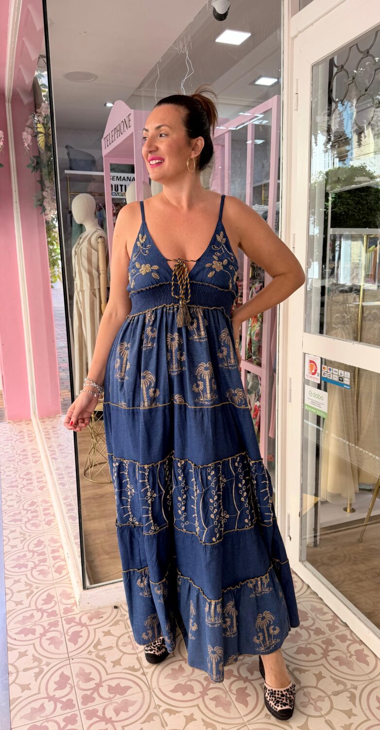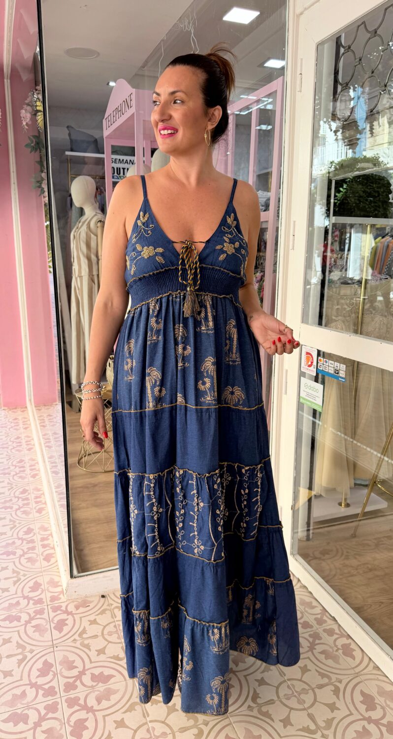 La versión larga de nuestro icónico vestido Malibú llega para convertirse en la pieza estrella de tu maleta de verano. Este maxi vestido combina la atemporalidad del color azul denim con un exquisito bordado artesanal en hilo dorado, creando un contraste vibrante y lleno de luz. Su caída fluida y sus detalles étnicos lo hacen perfecto tanto para un evento de día como para una noche especial frente al mar.