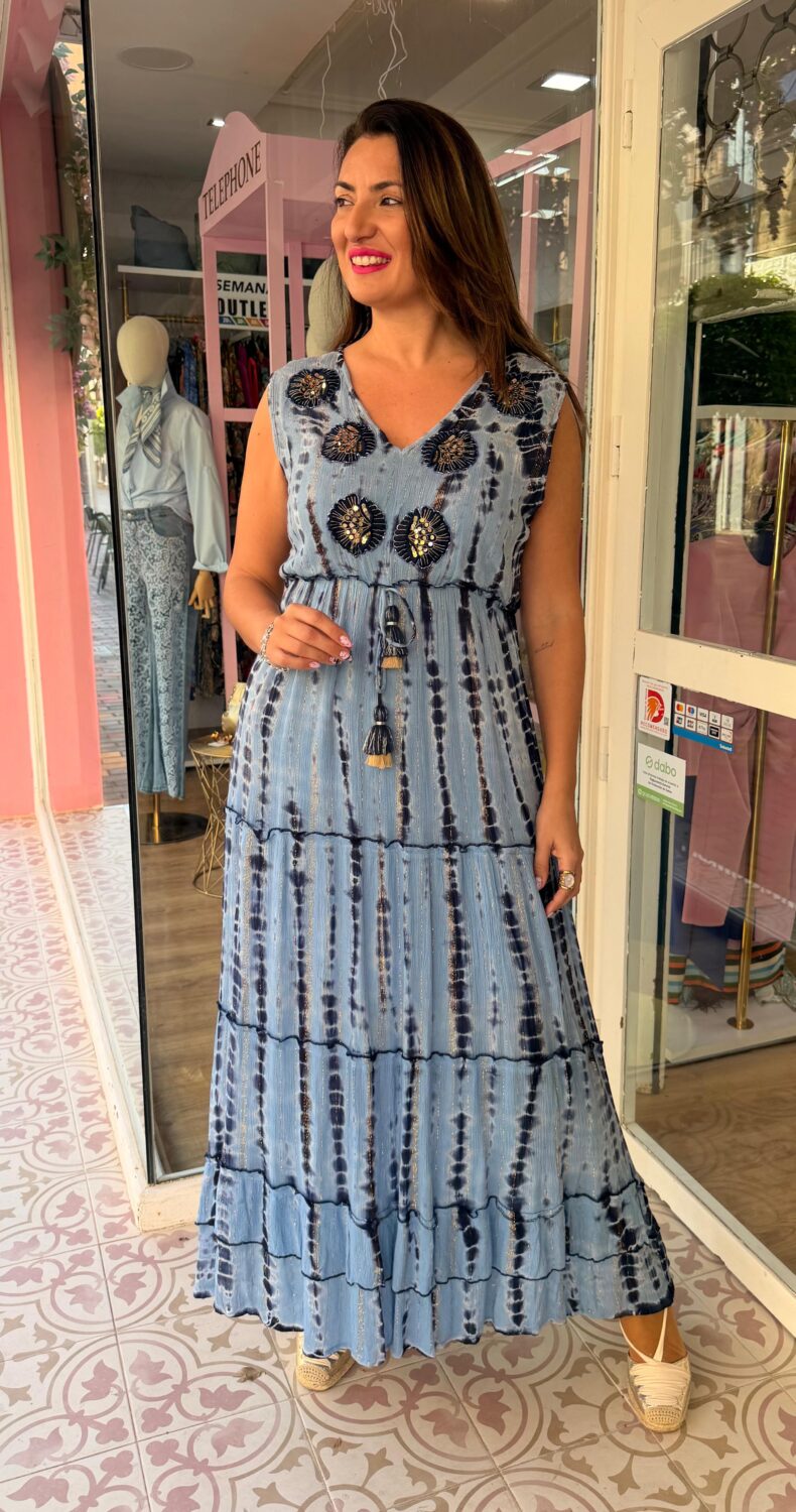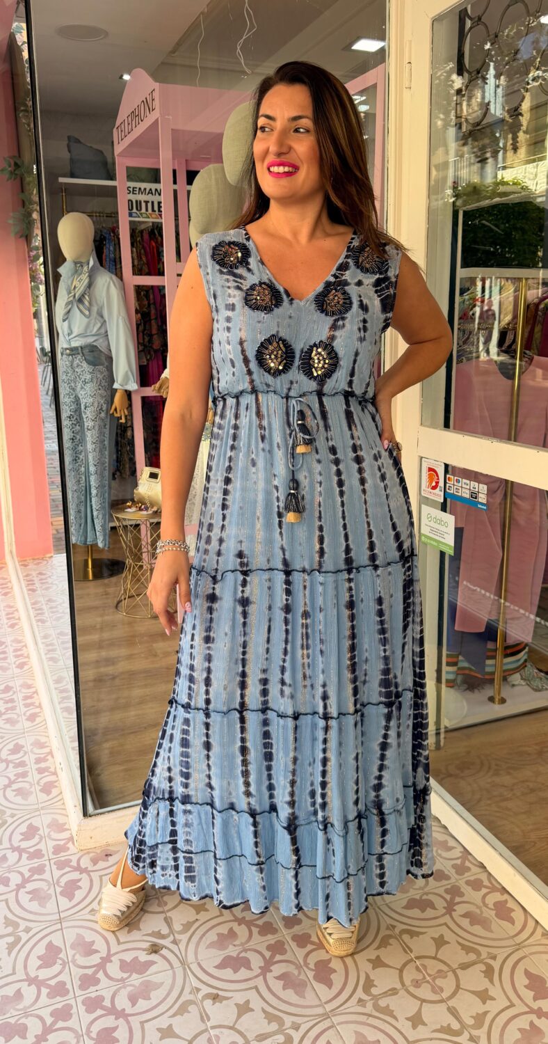 Este espectacular vestido largo en tonos azulados presenta un delicado efecto de teñido artesanal que crea un patrón de rayas verticales muy favorecedor para la silueta. El cuerpo destaca por su escote en V adornado con aplicaciones circulares de pedrería y cristales en contraste que aportan un brillo lujoso y artesanal a la prenda. Cuenta con un ajuste de cordón en la cintura rematado con borlas decorativas que permite entallar la figura de forma personalizada mientras da paso a una falda fluida compuesta por varios volantes horizontales que generan un movimiento espectacular al caminar.