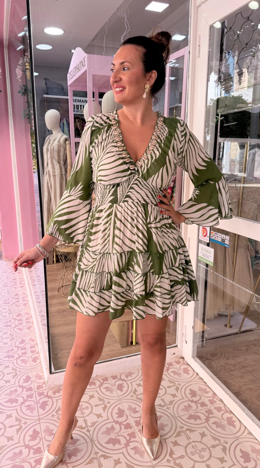 Añade un toque exótico y sofisticado a tu armario con nuestro vestido corto de inspiración botánica diseñado para favorecer la silueta y ofrecer la máxima comodidad a través de su vibrante contraste en color verde.