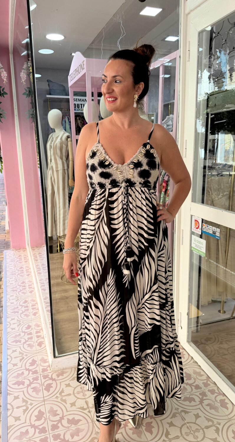 Siente la esencia del verano con este espectacular vestido largo de estilo bohemio que combina un diseño artístico con detalles artesanales únicos para crear una pieza imprescindible en tu colección
