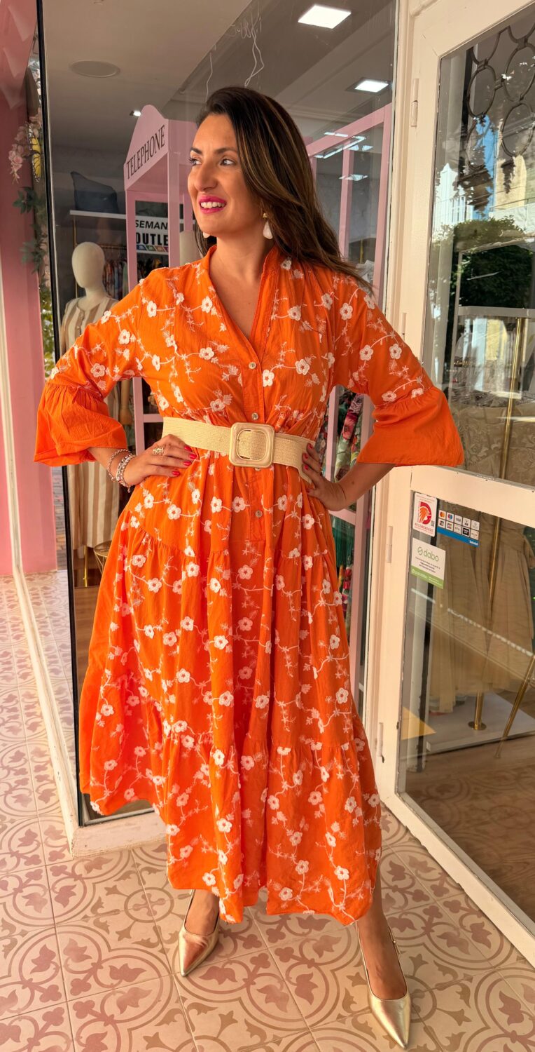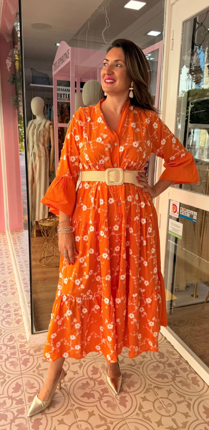 Este vestido maxi es la versión extendida de nuestro diseño más buscado, perfecto para quienes aman el estilo bohemio con un toque de elegancia majestuosa. Confeccionado en un vibrante tono naranja, destaca por su espectacular caída en niveles que aporta volumen y un movimiento fluido lleno de personalidad.